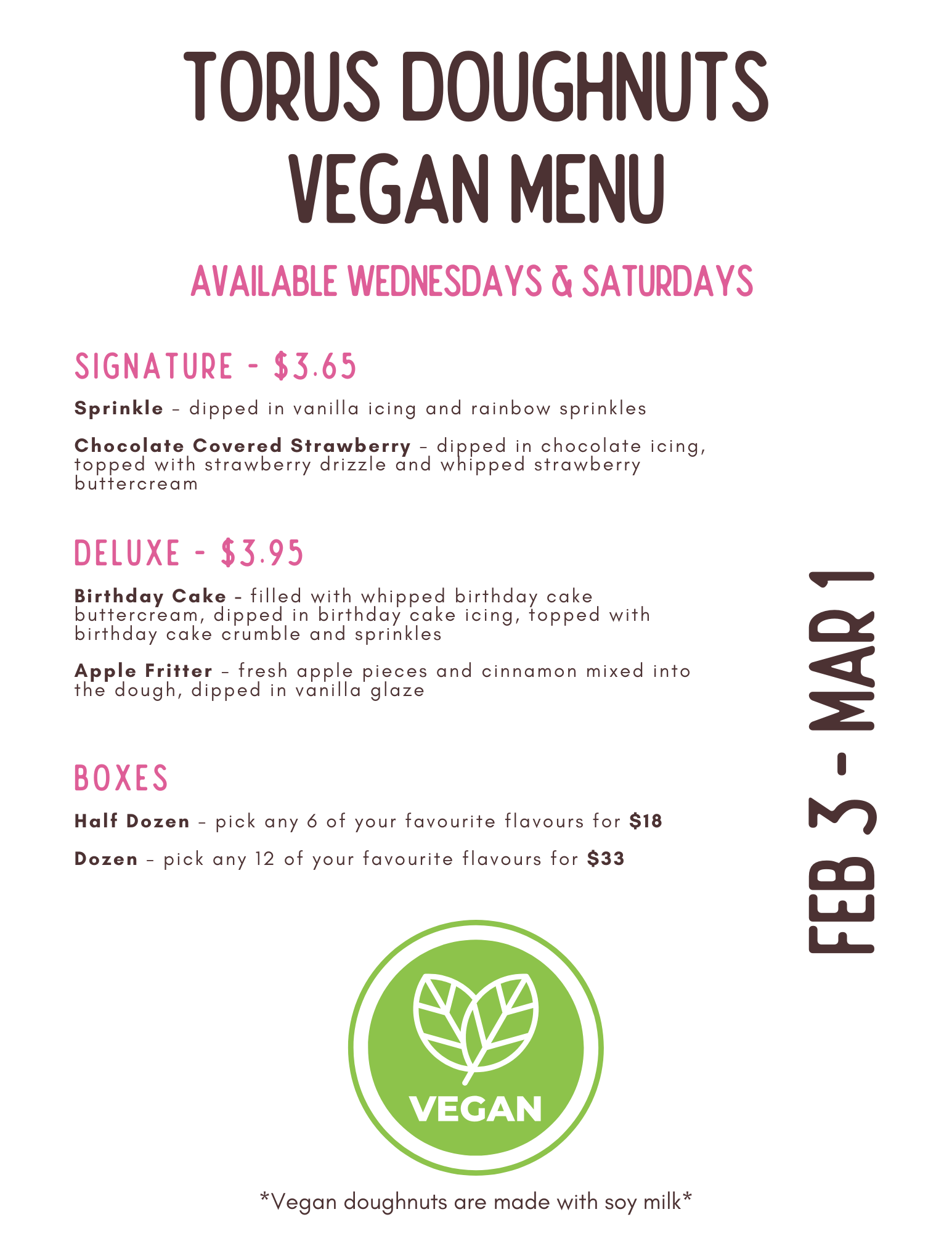 February Vegan DoughnutsAvailable on Wednesdays and Saturdays